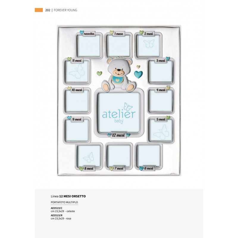 Portafoto 12 mesi in argento linea orsetto celeste e rosa ATELIER